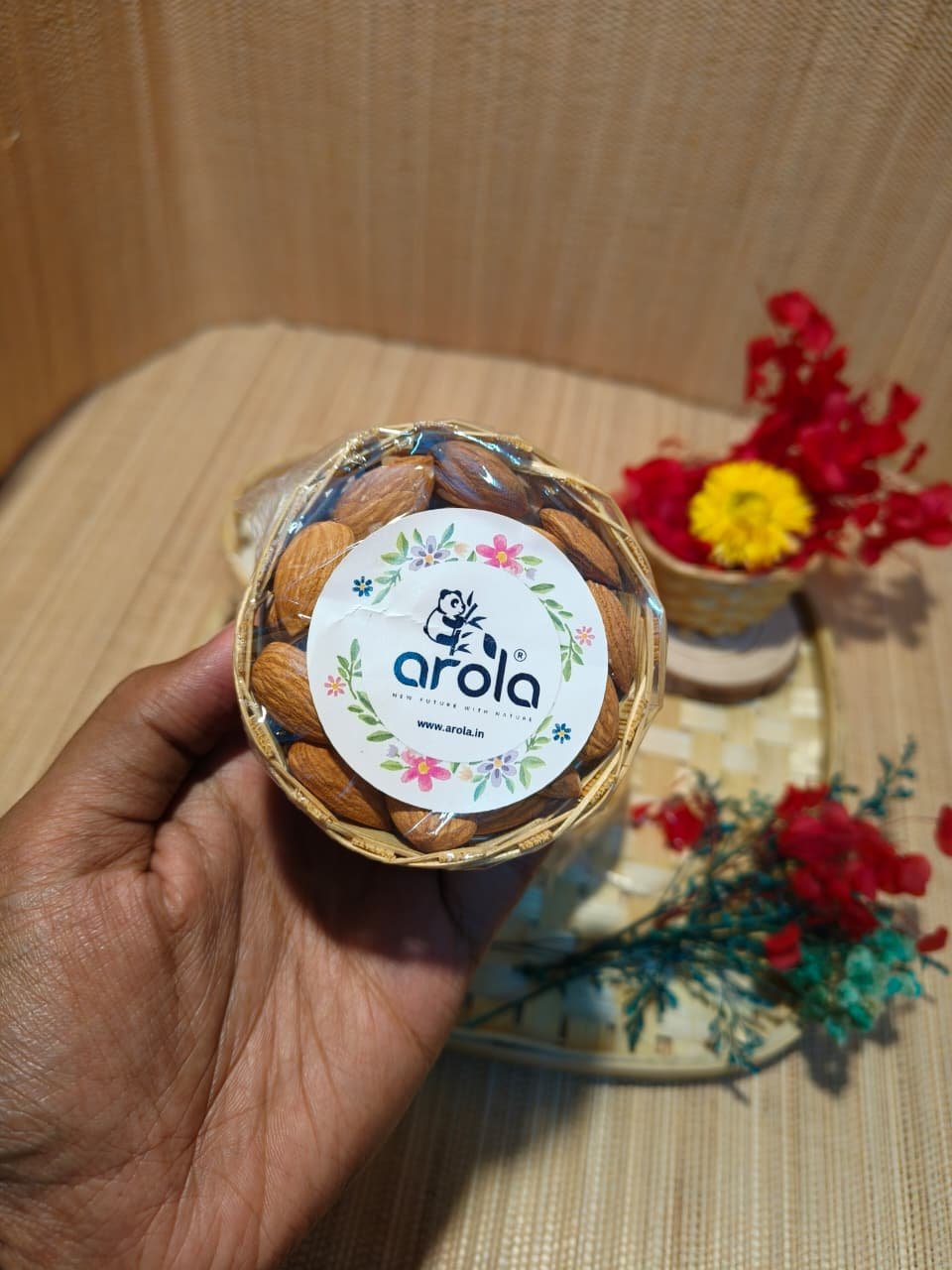 ???? 4 Mini Bamboo Baskets filled with premium Badam, Cashew, Chocolate, and Dry Grapes