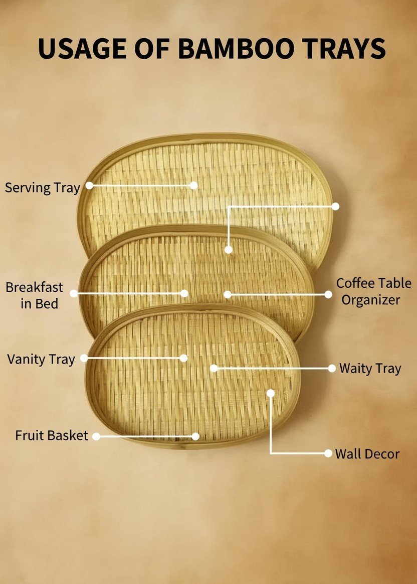 Organize and serve with style using our Bamboo Tray 3-in-1 Set. Handcrafted from natural bamboo, this set includes three different-sized trays that nest neatly together, offering versatility for serving food, snacks, or drinks. Sturdy yet lightweight, these eco-friendly trays add a rustic charm to your dining table and are perfect for both everyday use and special occasions.