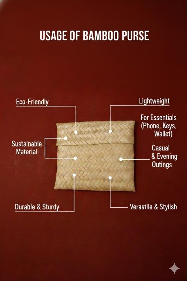 The Bamboo Purse is a beautiful fusion of sustainability and style, handcrafted from natural bamboo by skilled artisans. Its sleek design and fine detailing make it perfect for both casual outings and festive occasions. Lightweight yet durable, this purse offers ample space for your essentials while showcasing an earthy, natural charm.